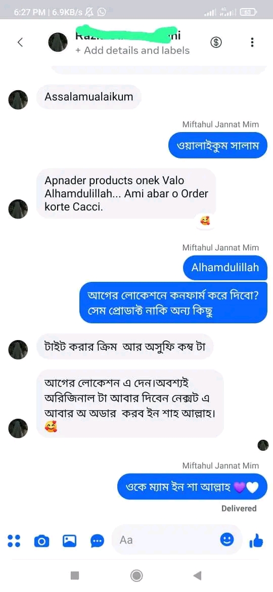 আপনাদের প্রোডাক্টসের কোনো সাইড ইফেক্ট নেই। প্রোডাক্টগুলো ব্যবহার করে আমি অনেক উপকারিতা পেয়েছি। আজকাল অরিজিনাল প্রোডাক্ট পাওয়াই যায় না। একটা প্রোডাক্ট কিনতে গেলে আমরা অনেক চিন্তাভাবনা করি অরিজিনাল হবে কিনা। আমাকে অরজিনাল প্রোডাক্ট দেওয়ার জন্য আপনাদেরকে” অসংখ্য ধন্যবাদ।